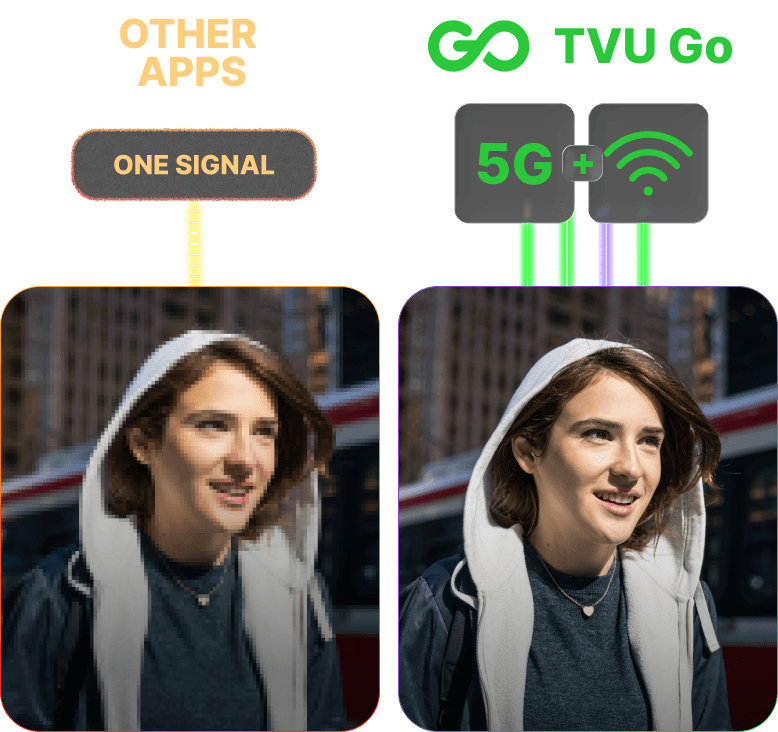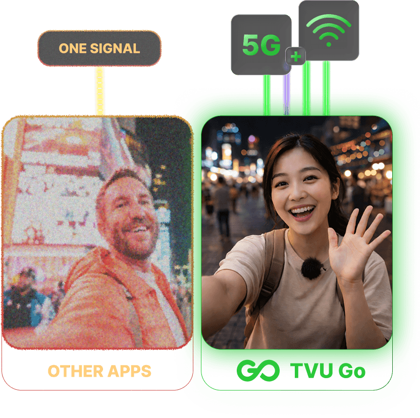 Most apps rely on a single connection. When it drops, your stream breaks. TVU Go relies on the same ISX protocol used by the TVU IRL backpacks to aggregate 4G/5G, Wi-Fi, and tethered phones into one stronger stream, so you stay live even when one signal fails.